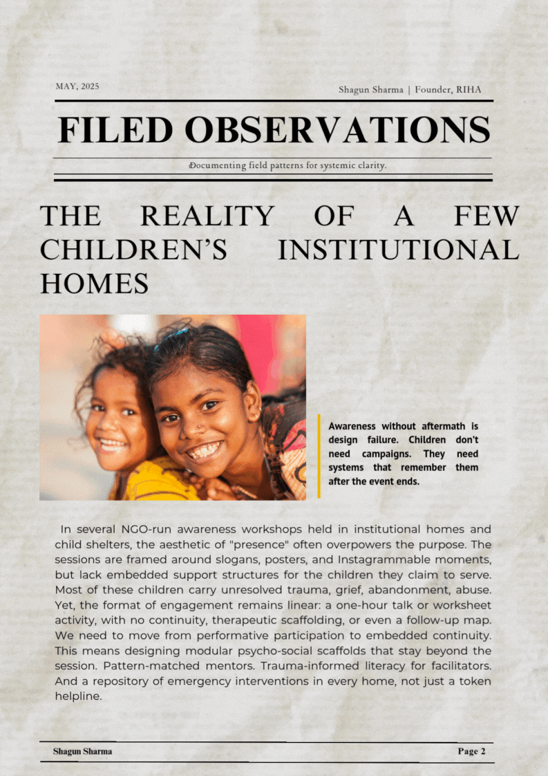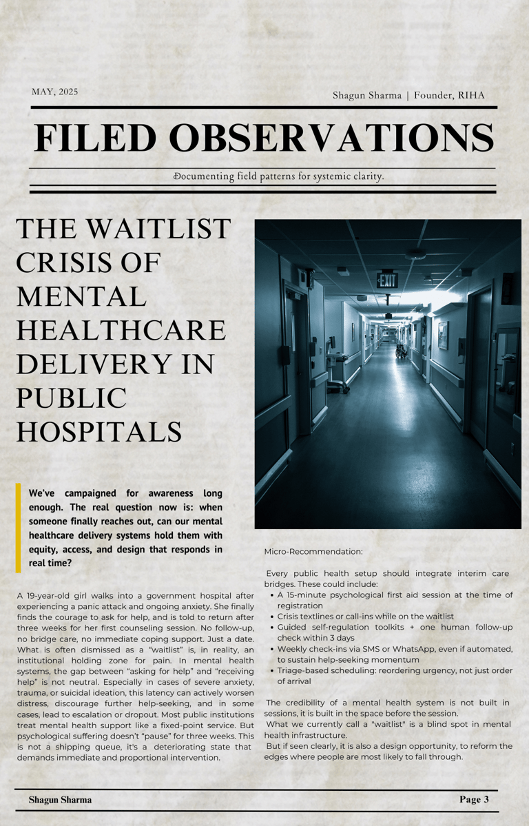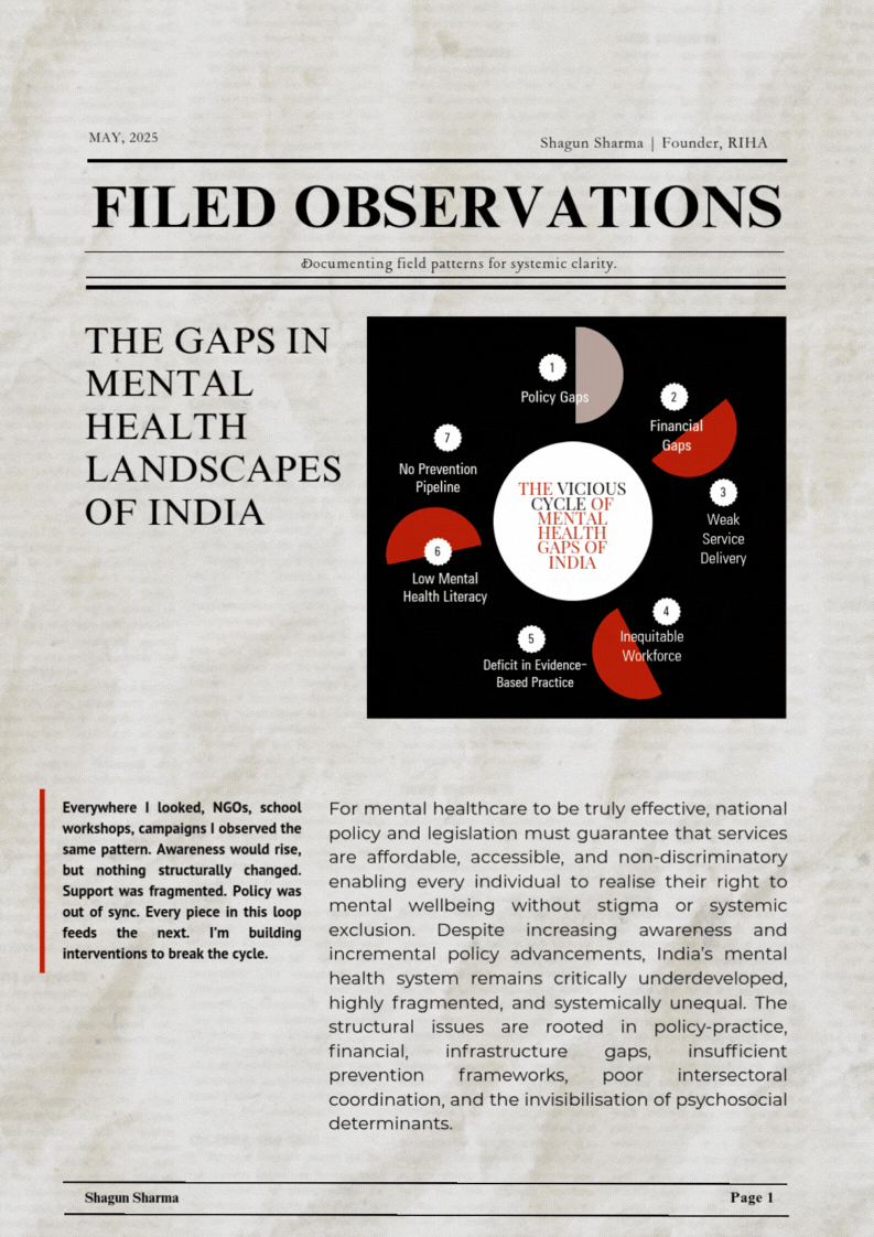 Shagun Sharma is a Mental Health Reformer, Psychology Graduate, and Founder of Reform for India’s Mental Health Advocacy(RIHA). She works at the intersection of community psychology, policy reform, and systems design, building scalable, research-driven models to strengthen India’s mental healthcare ecosystem.